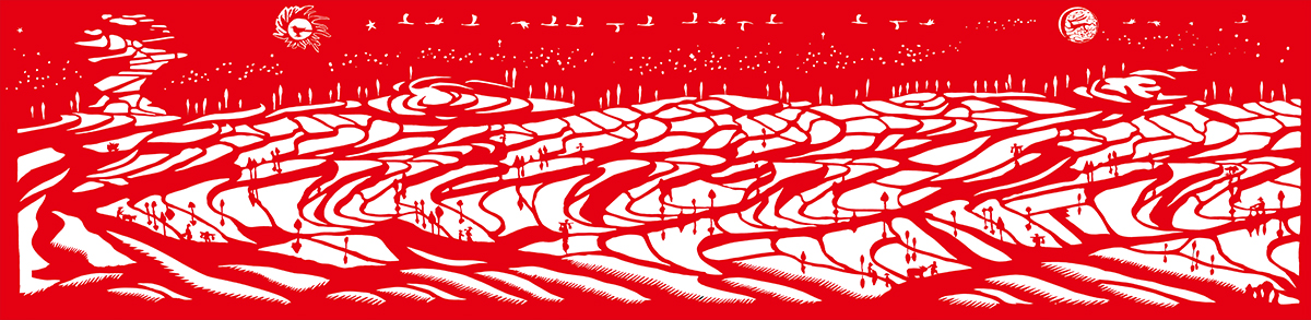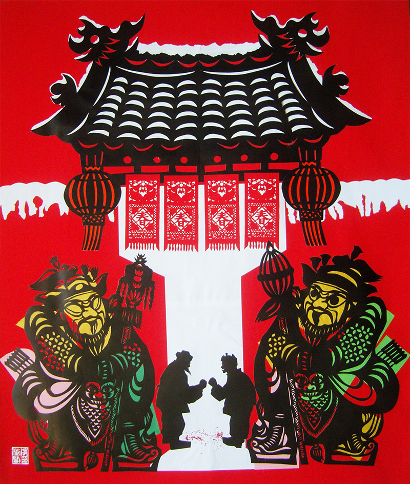 当然,尽管剪纸的发展,并不完全以尺幅的大小为标准,但是创新型的现代剪纸,能够从剪纸大妈的藤扁飞向通衢大道的墙壁,不能不是中国剪纸艺术的飞跃。