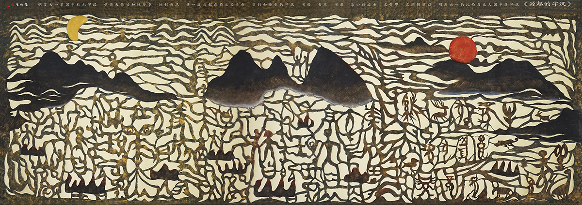 其次,张树贤剪纸作品所表现的外延大大地延伸了。传统民间剪纸主体部分,离不开窗花、喜花、器饰,仿佛是寄怀于民间剪纸大娘藤框里的东西。现代剪纸则可以与大幅书画并驾齐驱了。树贤的大幅作品,将剪纸与环境联姻,为博物馆、宾馆、地铁创作了不少大型的剪纸壁画。如《汉字的起源》,是为山东枣庄微山岛“中华剪纸文化园”大厅设计的壁画,后又被温州维日康树贤艺术博物馆永久收藏。《天·地·人》、《农、林、牧、副、渔》,则首次被北京地铁10号线选用作环境艺术壁画。这也就是说,创新型的现代剪纸,已经明白无误地进驻人间社会的“大雅之堂”。这在先前是不可想象的。