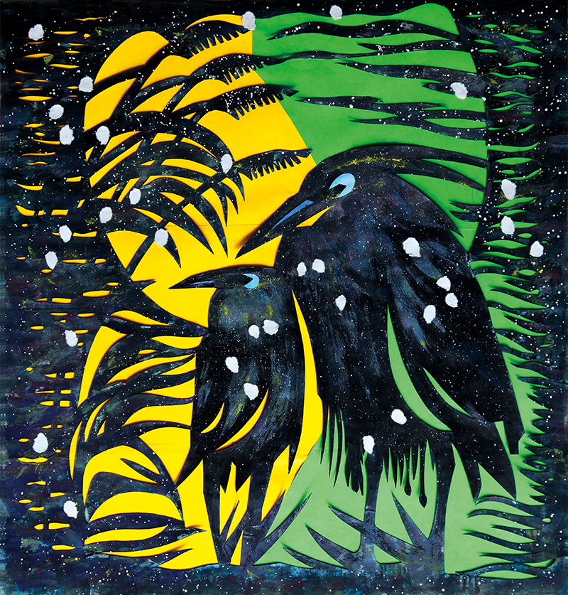 当然,笔者不是说,传统民间剪纸都是小的一一其实也有大幅的;现代新型剪纸都是大的一一其实也有小幅的。剪纸的优劣,并不以篇幅的大小论英雄。张树贤先生的作品《清韵》,剪了一株树,篇幅并不大,它上通天穹,下接地气,枝繁叶茂,巍巍而立,以物喻人,体现吾侪的坚定信念和人格力量。这幅作