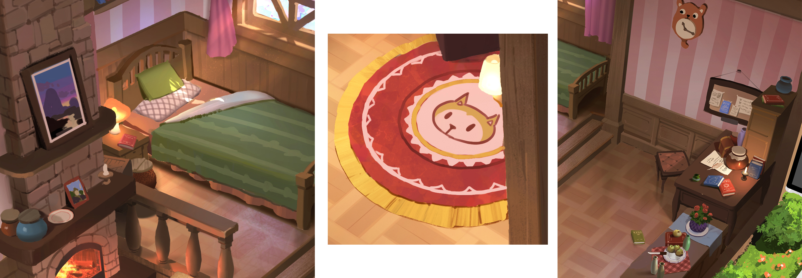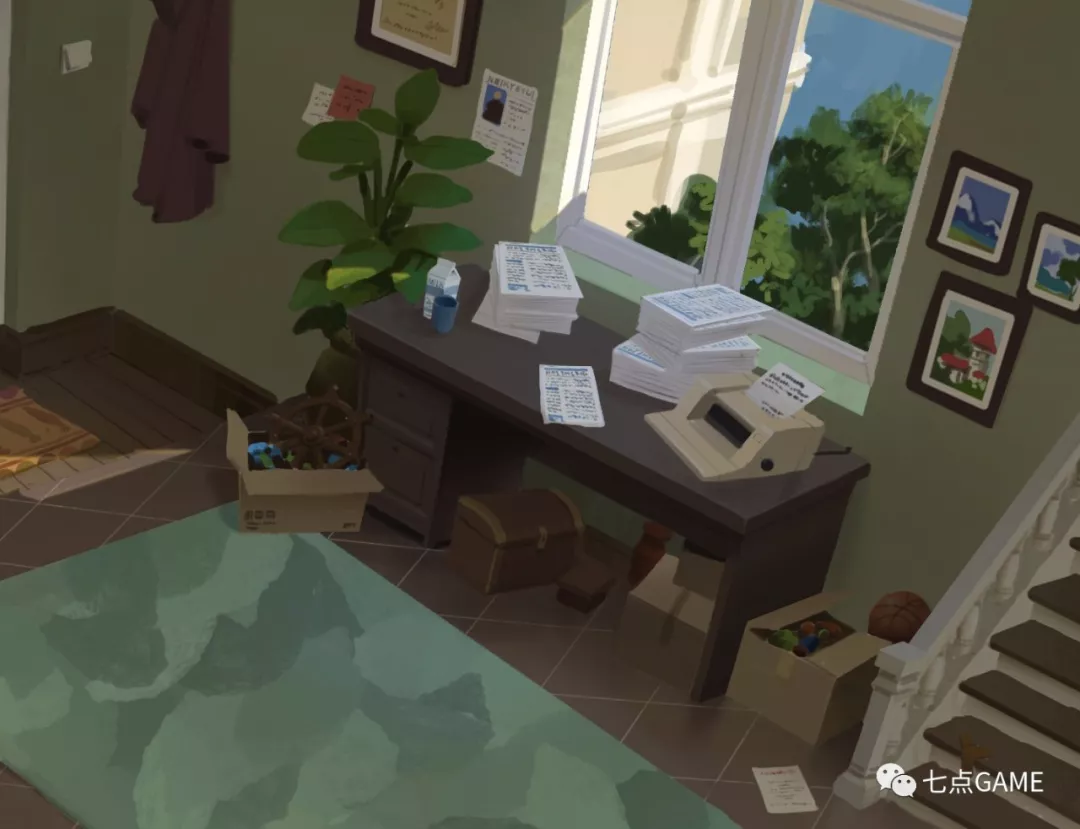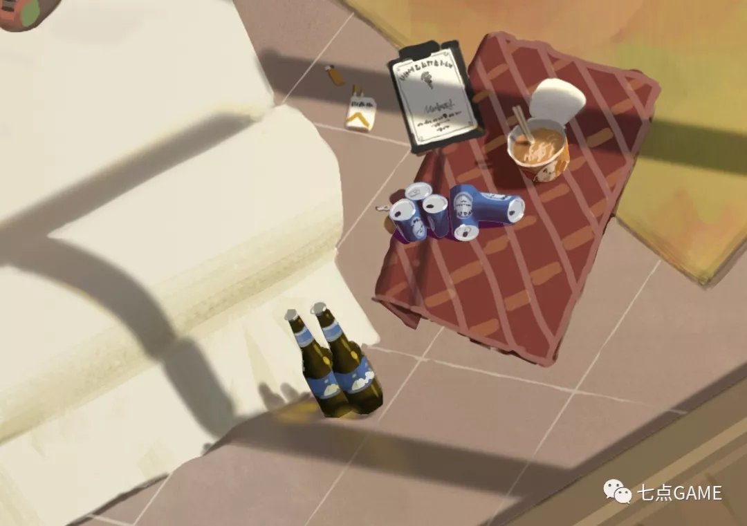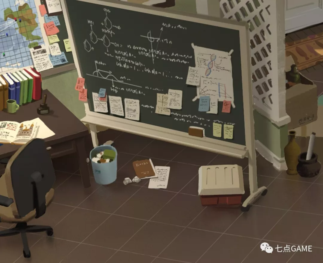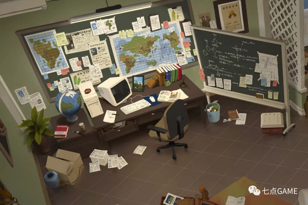 这个房间内除了基础必备家具外,还有很多代表探险相关的元素:记事本、地理或文学类书籍、部落小玩偶、电脑、地球仪、2个黑板上标记各类书籍笔记参考资料、地图、旅行纪念照、打印机、便签等。一些还没来得及打扫的生活元素,啤酒瓶香烟泡面、探险生死合同什么的、堆满的旅行箱等