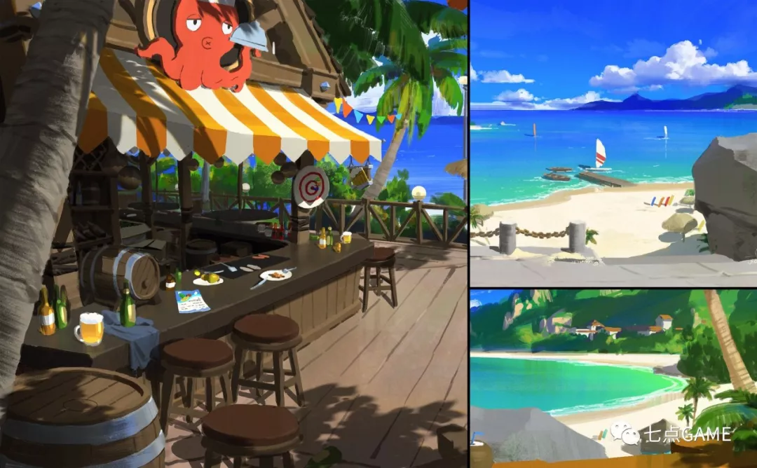 吧台上,提供了啤酒、铁板烧、水果、冰饮等。包括一些小设计酒桶、桌椅板凳、飞镖等日常可以玩的东西,符合生活的一些细节。招牌也用了夸张手法。整个场景就是海边的生活,椰树、沙滩、帆船、灯塔等细节