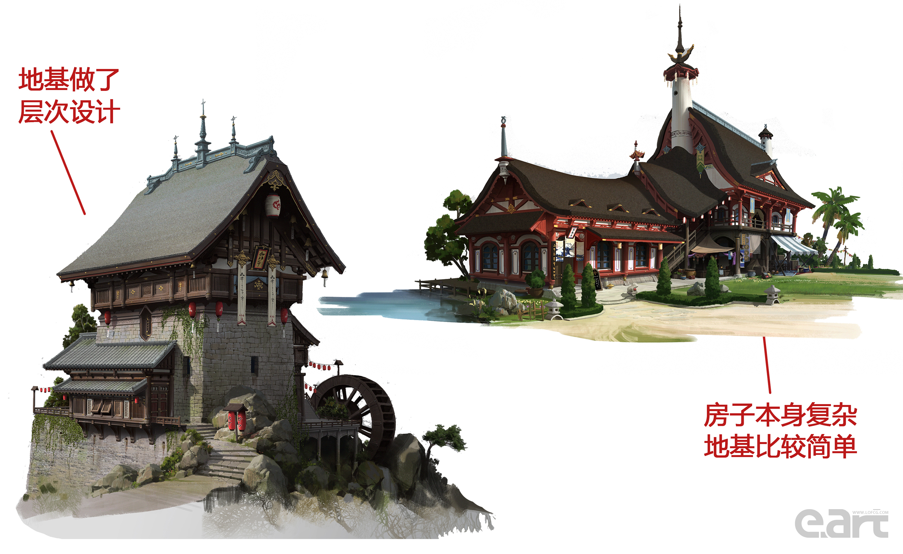 如果说房屋设计比较简单,那么可以把地基做一些变化,多做一些繁密的细节,使疏密搭配得更好~地形做一些设计~