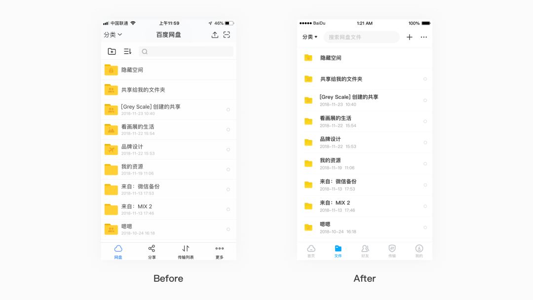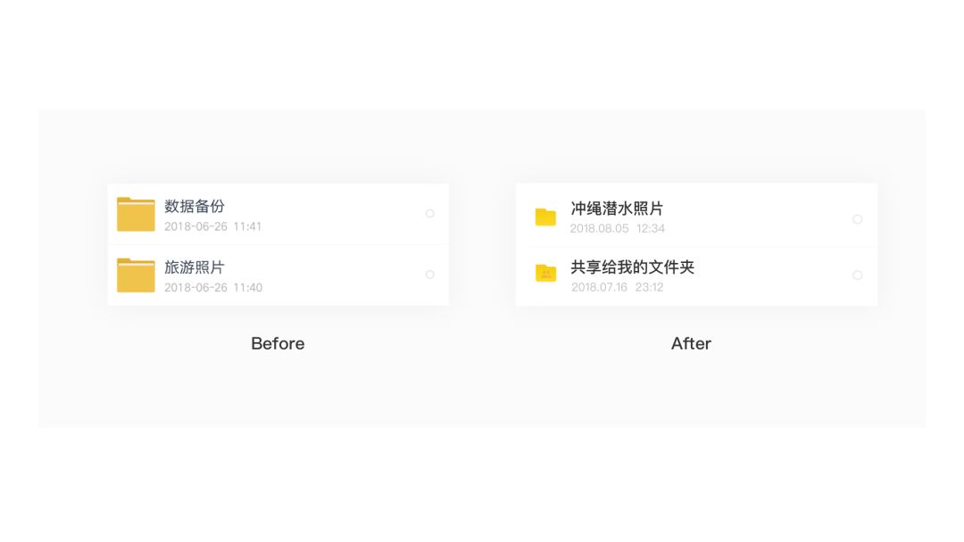 改版前,用户打开文件列表,首先看到的是满屏黄色的文件夹,而这些并不能帮助用户进行浏览或筛选,反而会造成视觉干扰。