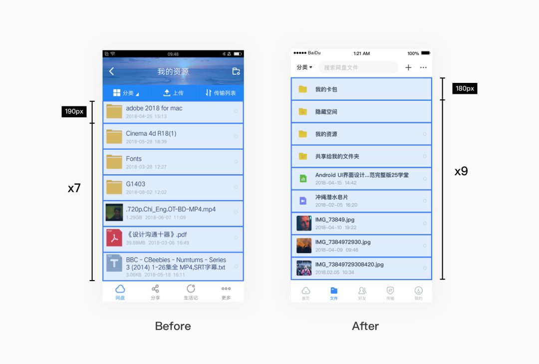 以下是旧版安卓端和改版后对比,去除顶部蓝色双导航的同时,通过缩小文件图标,进而缩小列表间距。