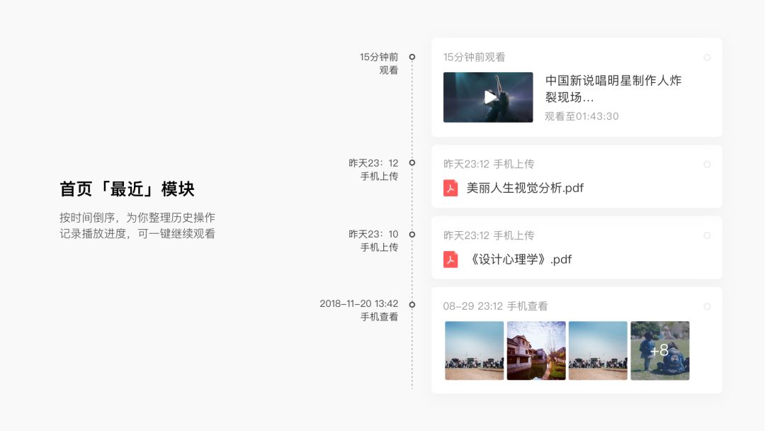同时在首页新增“最近”功能,方便用户便捷查找历史操作,而不是像以前,反复点击层层相套的文件夹去浏览与查找。