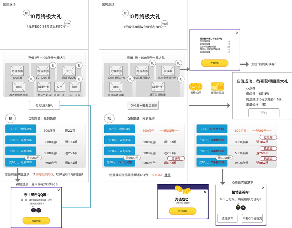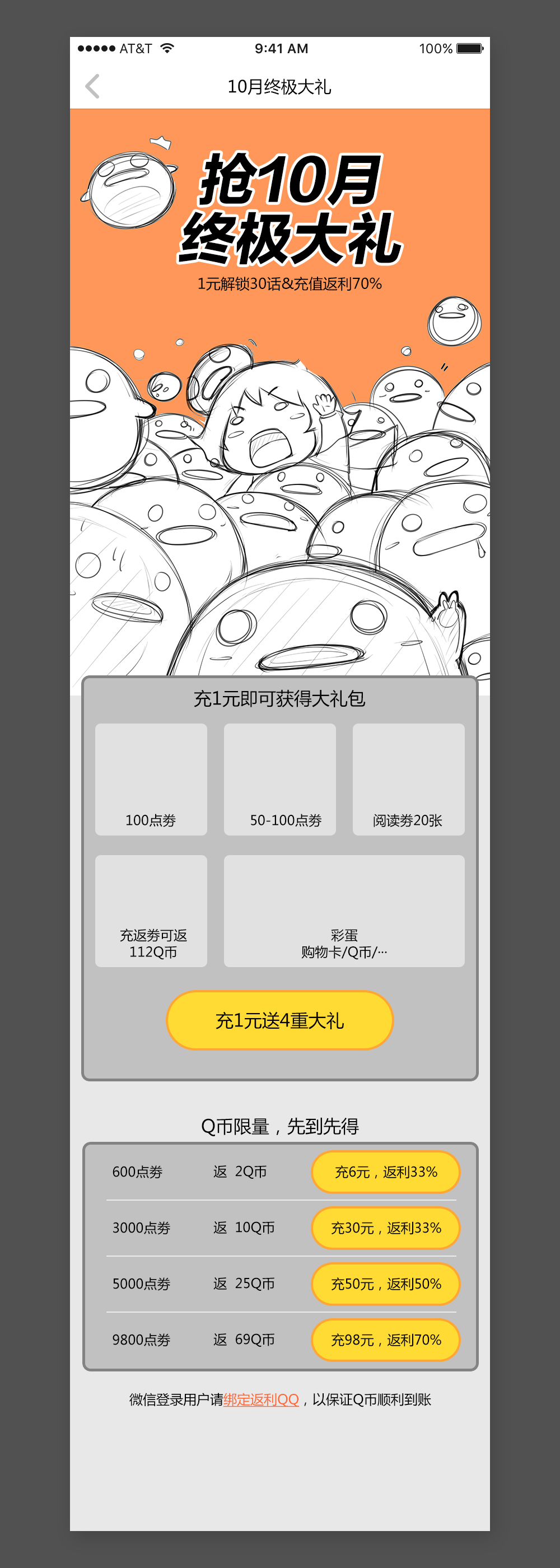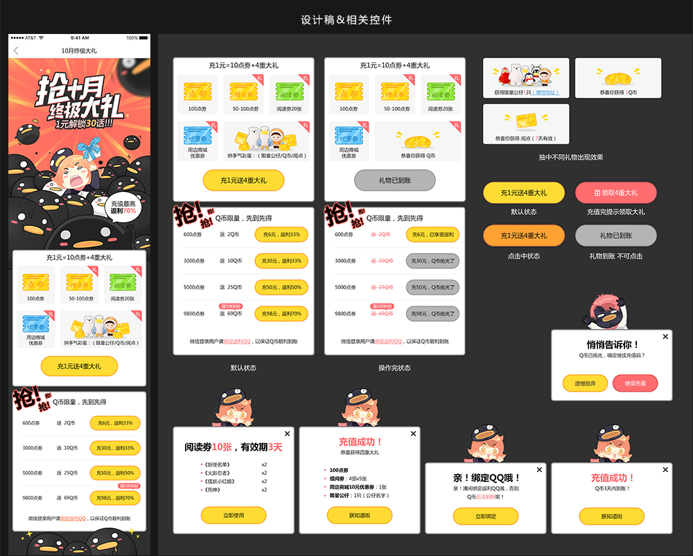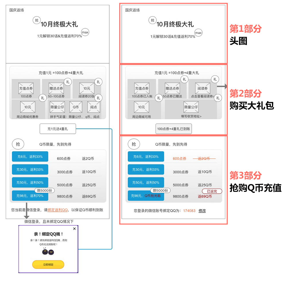 需求稿里面有这次宣传页的所有交互图示,整个活动可以分为三个部分,第一部分头图,第二部分点击购买大礼包,第三部分抢购Q币充值。