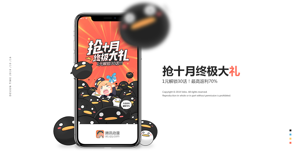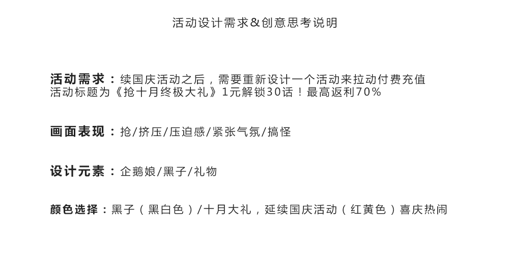 画面猪脚不用多说了,本身自有的品牌形象企鹅娘+小黑子!画面色调选择,这里的关键字是10月,10月会有延续国庆的feel倾向,所以这里我选择用红黄色为主!(好吧其实是我瞎比比的,因为我本身喜欢这个颜色搭配,哈哈哈~)