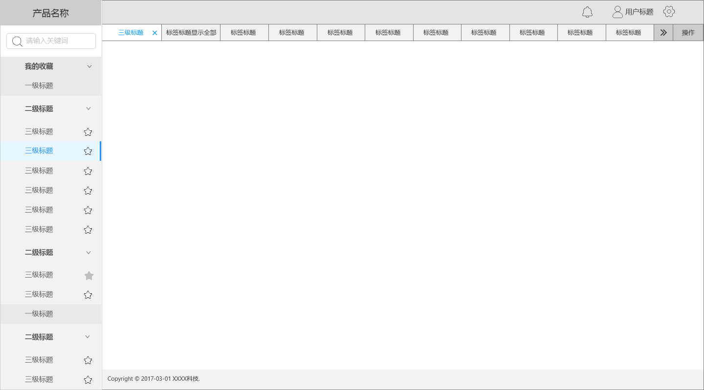 上图中,我们先看左侧导航的结构。这里分为一级导航、二级导航和三级导航,其中一级标题是固定的不能被展开和收起的,可以用于项目名称展示,二级标题是可以通过点击进行展开和收起的,展开后看到的就是三级标题,请注意,这里点击二级标题,在右侧的内容区是没有内容的,当点击三级标题时,才会在内容区出现内容,所以内容区上方的标签栏其实是三级标题的展示区。
