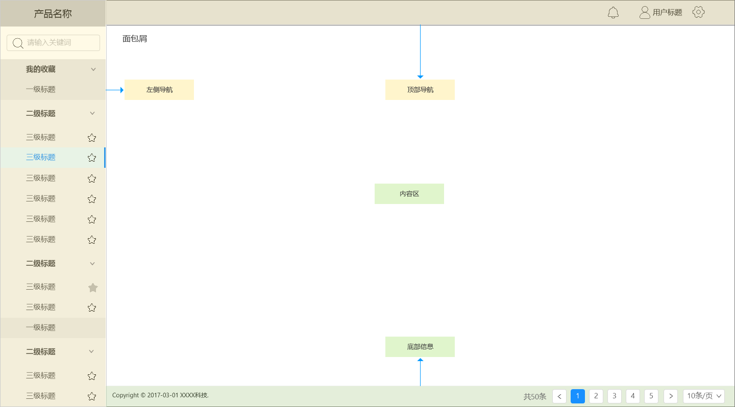 一般的后台系统界面框架可以分为几大区域,左侧导航、顶部导航、底部信息、内容区。左侧导航的目录结构根据业务内容可分为单层级和多层级,顶部导航主要包含消息通知、个人中心和设置,底部信息一般展示版权信息和联系方式,中间最大的空白区就是可以大作文章的内容区了。