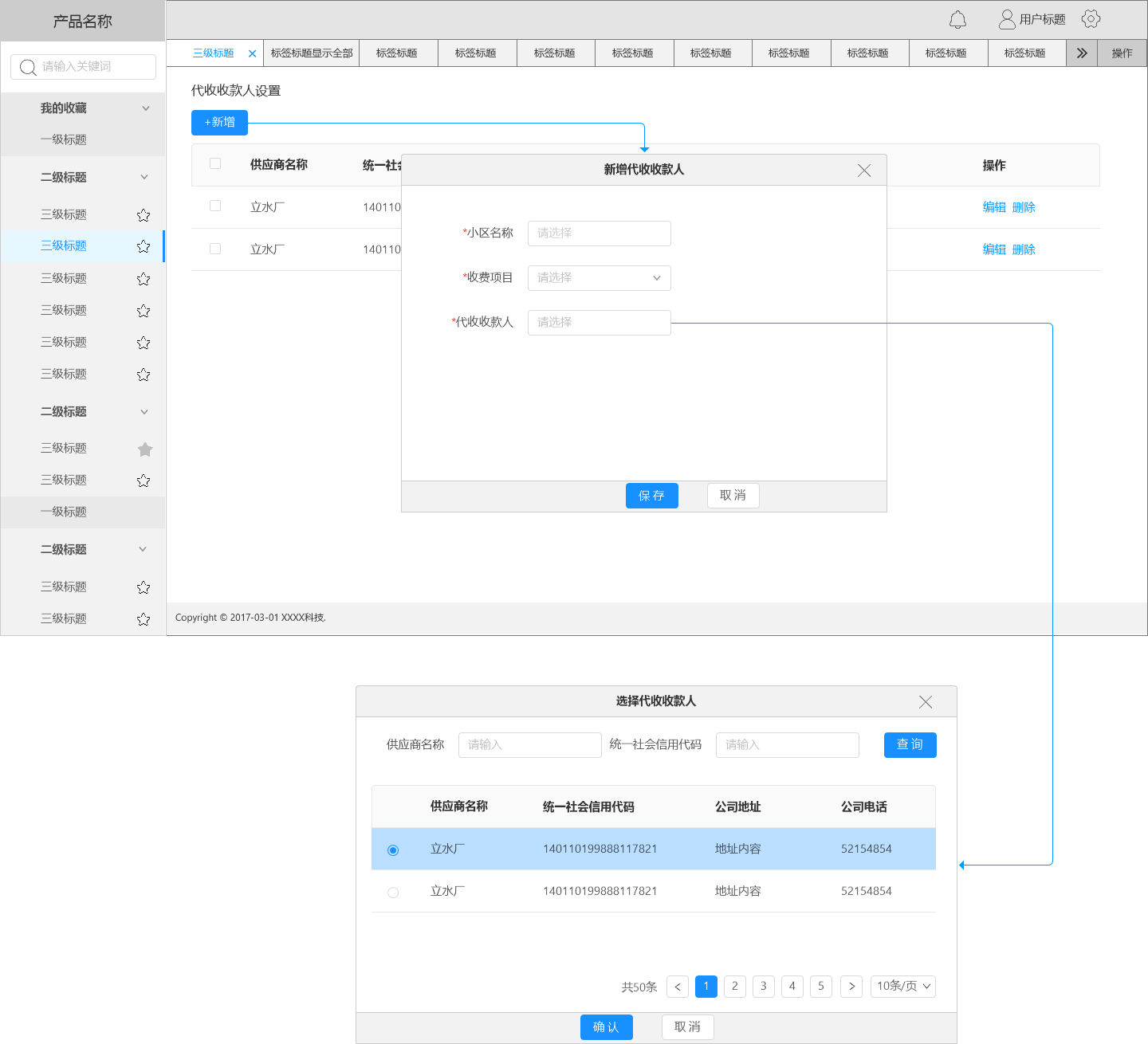 上面的交互中出现了弹框上还有弹框,这种情况是需要避免的,所以我们通过面包屑导航来避免双弹框。