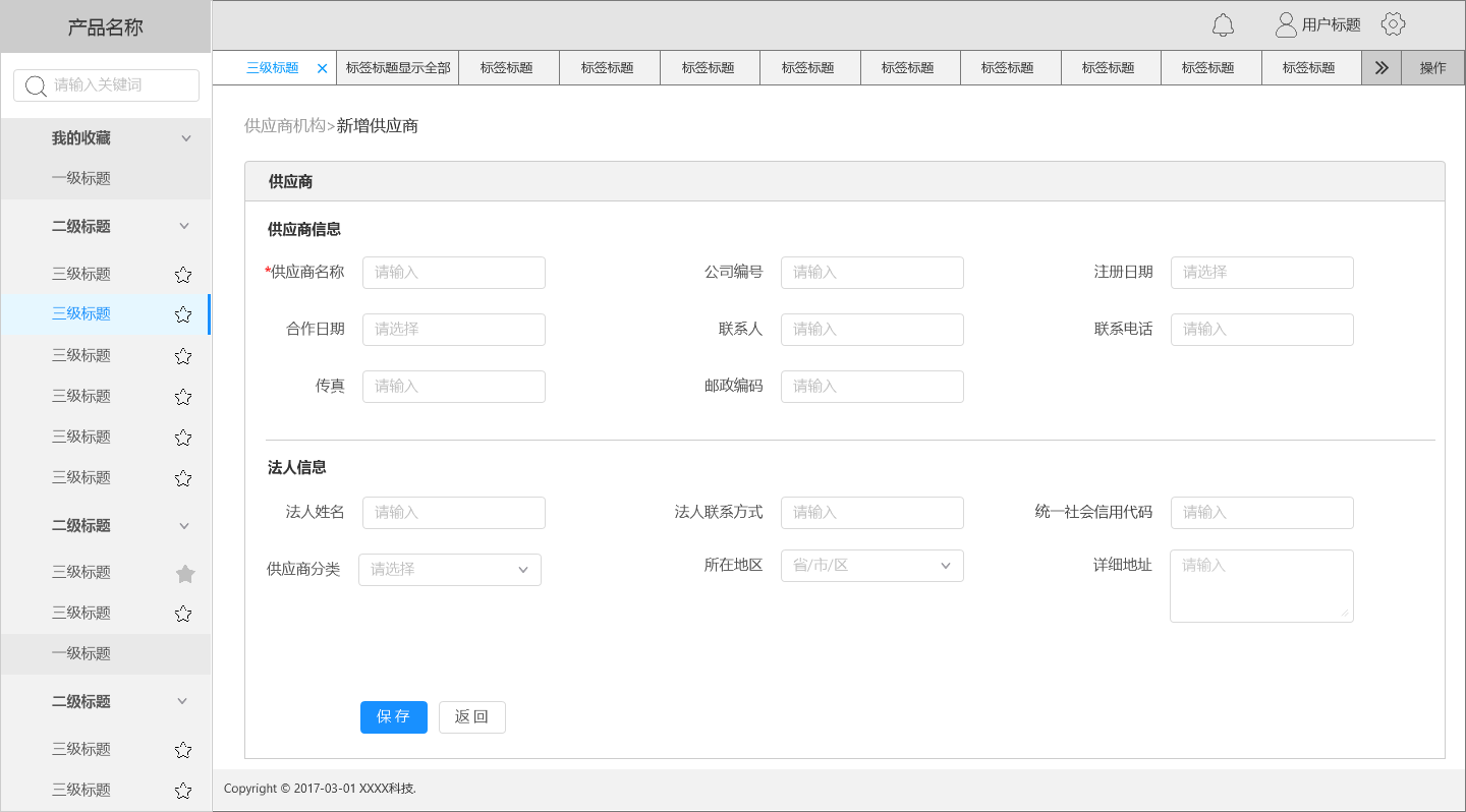 界面中的【供应商机构>新增供应商】就是这个页面的面包屑导航,告诉用户当前页面是新增供应商页面,它的上级是供应商机构,点击供应商机构可以返回到上级页面。