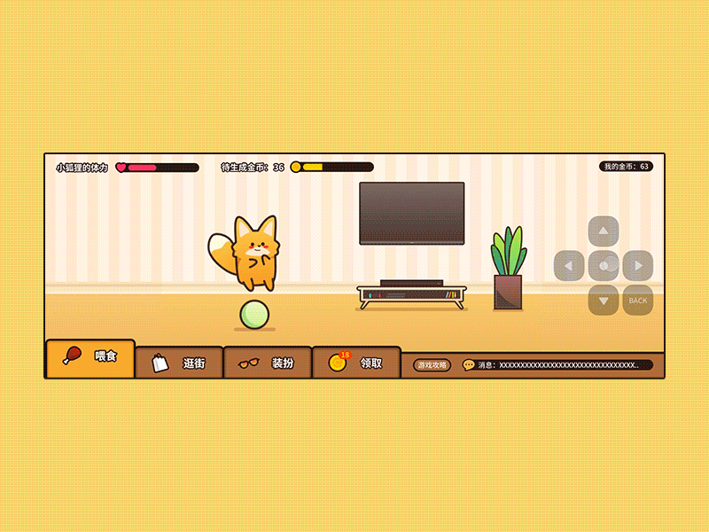玩过支付宝的蚂蚁森林或者菜鸟裹裹的精灵书屋的同学可能会有一个同感,就是这类小游戏其实都做的比较简单,说是游戏其实更偏向于一个工具,只是用游戏的概念包装了一下,让用户更容易接受。在这个游戏内,用户可以通过喂养、玩耍等行为培育一只属于自己的小狐狸,小狐狸会按照一定的规则赠送给用金币,金币可以用来兑换礼物等等,从而和酷开系统的会员体系行程一个闭环。