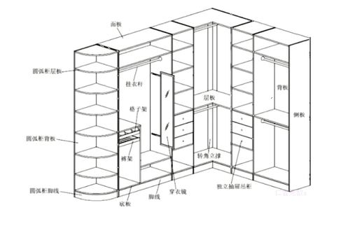 其中,衣橱的侧板、背板、层板以及内部的活动层板都是分步骤拼接而成的,包括其它的一些连接件,像拉手、晾衣杆等等。