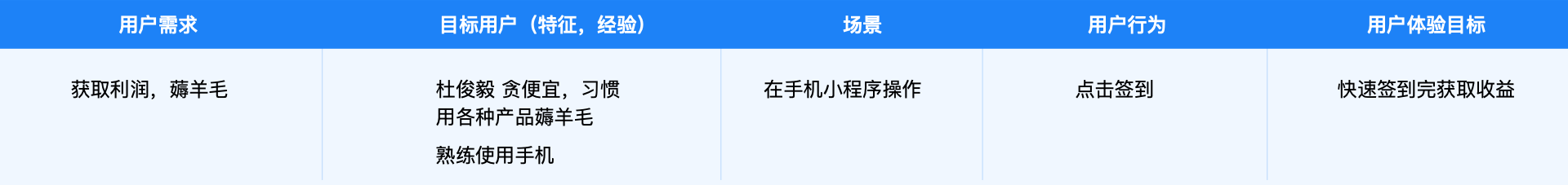 用户需求=目标用户(特征、经验)+用户场景+用户行为+用户体验目标