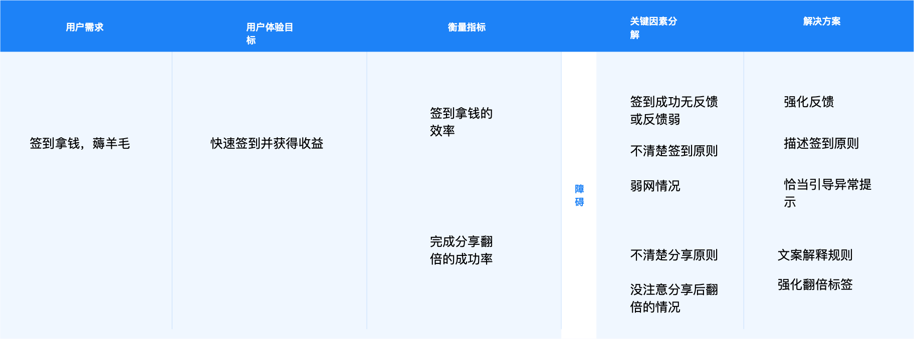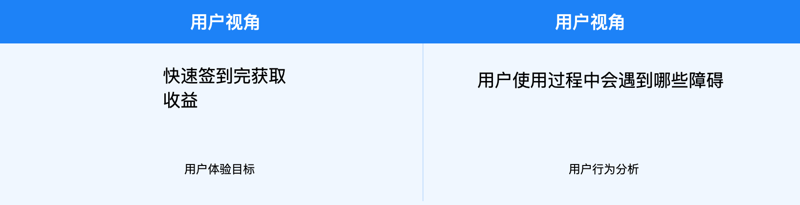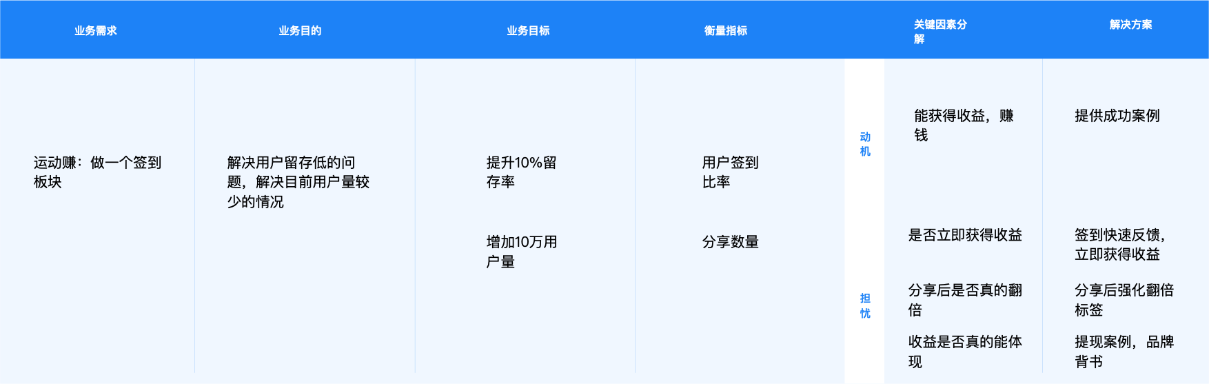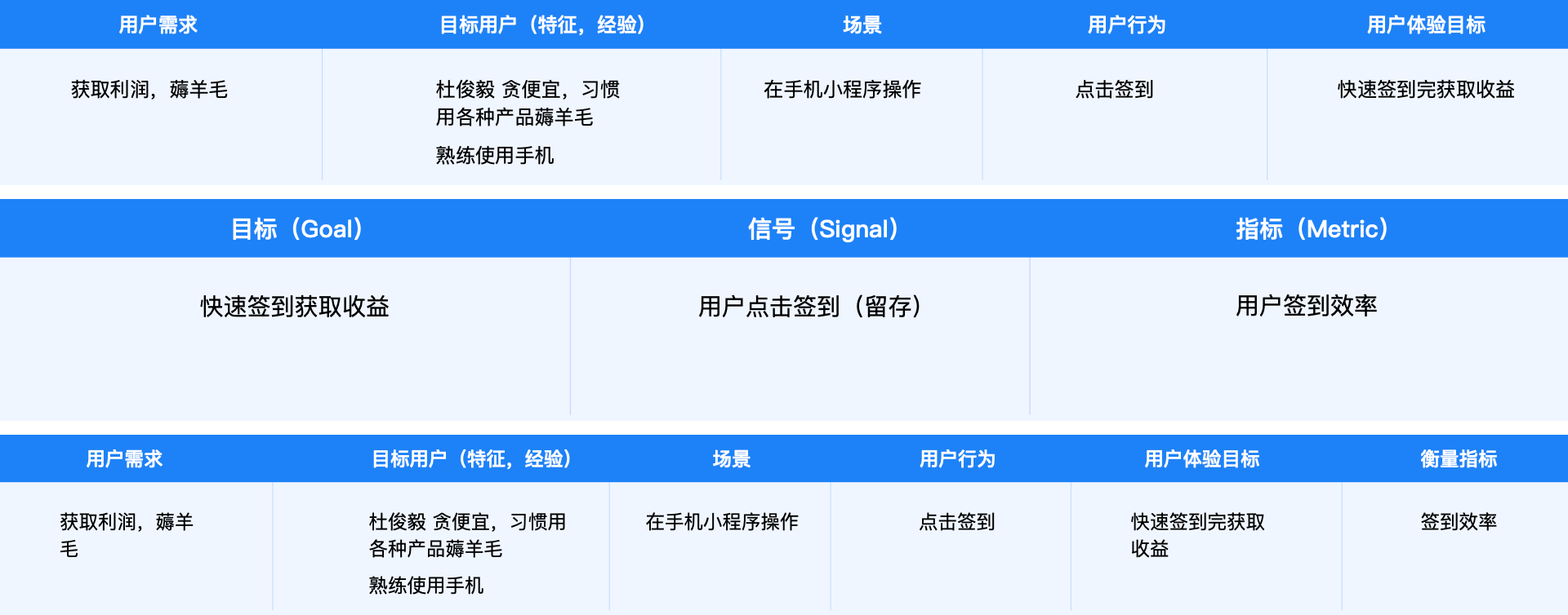 如图,接到签到模块的设计需求,我们首先明确了这个业务需求是什么,解决什么问题,想要达成一个什么数据或指标。注意,业务目的是偏向实际问题的一个概念,业务目标是一个偏向指标 数据的概念。得到目标后,我们希望围绕目标去设计用户行为再到设计用户界面,这个过程需要多步来完成。