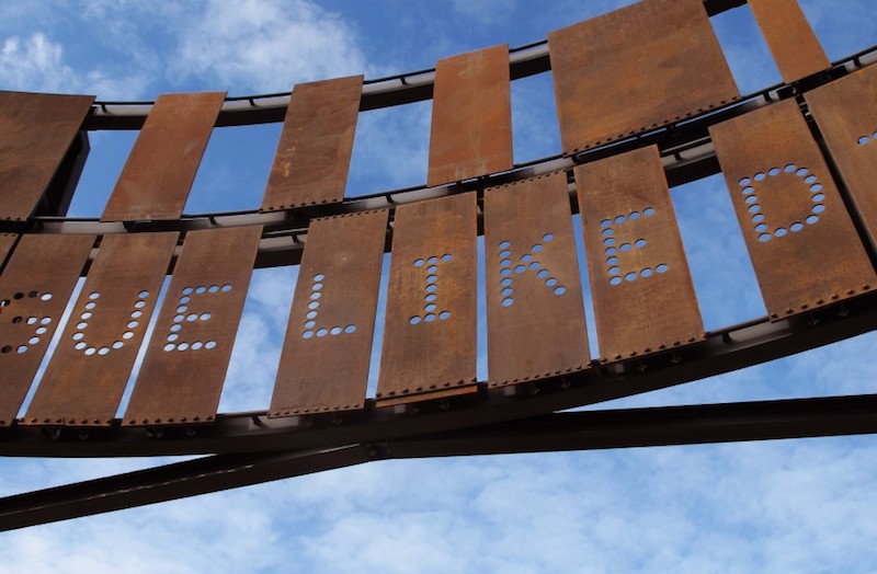Deuce design用一面黑色墙壁阐释这片土地曾是名为”Menevia”的海滨别墅,这片土地在此后经历了船舶压舱采石场时代,现为具有地域影响力的城市公园。为了阐释该公园的历史,在储油罐圆环上进行镂刻莱斯穆瑞的诗句构成一座雕塑性装置,圆点字体的灵感则来源于原本公园中的采石机械。在午后的阳光下,单词会在周围的表面上投下阴影,充满艺术感。在采石场遗留物上使用雕刻的方式进行导视,具有设计感,营造了一致性的景观空间。