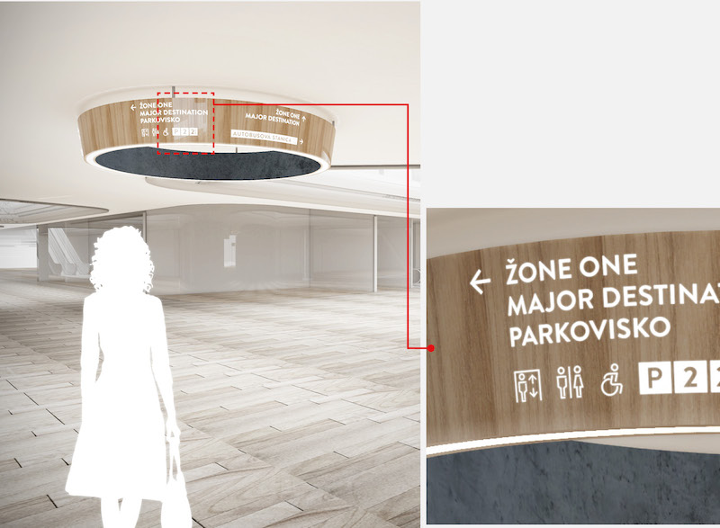 Space agency从其独特位置中获取灵感,购物中心位于布拉迪斯拉发以前的湿地区域,Nivy意为湿地,而购物中心把城市与湿地结合起来,旨在打造绿色自然的现代化商场,因此将混凝土材料和木材作为导视牌的制作用料。从作为购物中心基础设施的地面和地下区域到楼顶公共开放的绿色公园,混凝土和木材之间的占比逐渐过渡,体现了城市与湿地逐渐过渡的过程。整套导视系统使用有趣的过渡方式融合了交通、商场和生态公园,使人感到自然舒适。