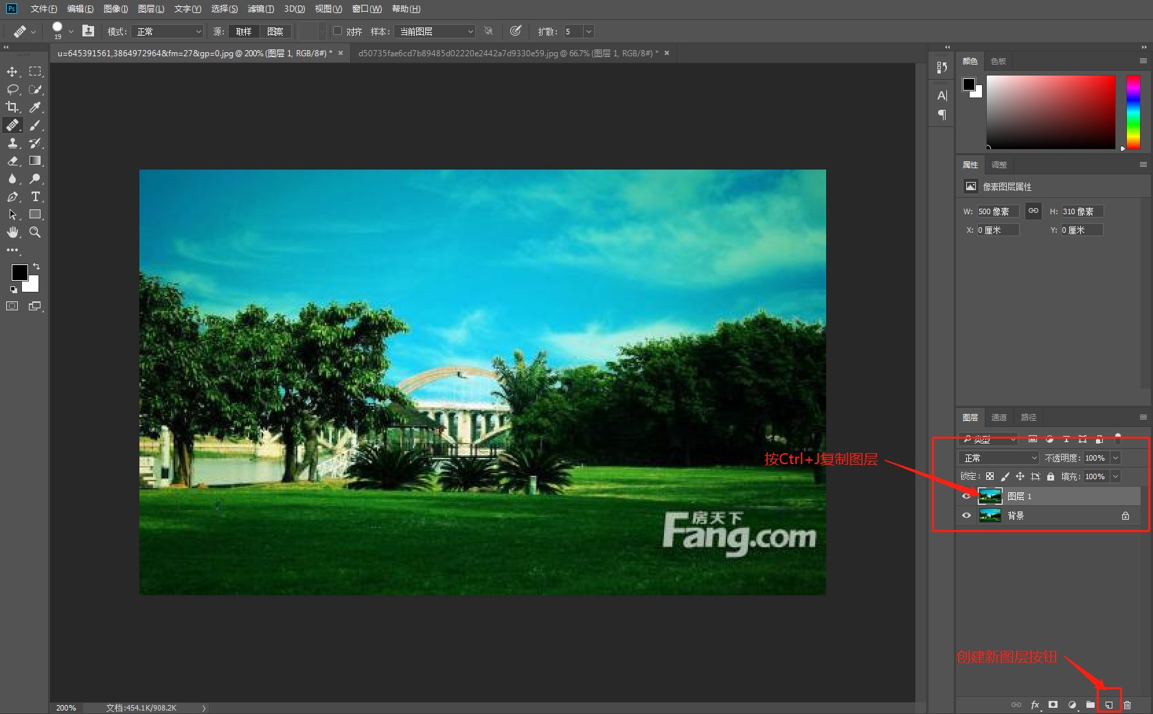 1. 双击打开PS,按Ctrl+O打开要去除水印的图片,选择背景层,按Ctrl+J复制图层或者将背景图层拖放到“创建新图层”上