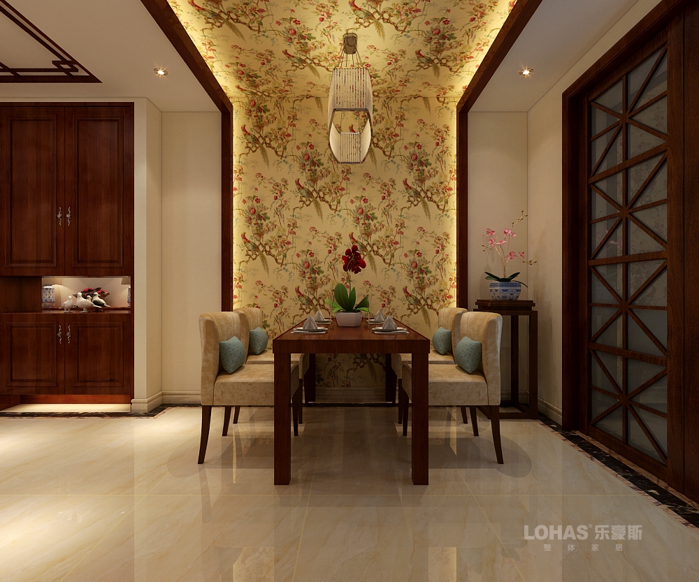 餐厅位置整体设计效果展示。餐厅位置的的整体设计,墙面用菊花壁纸进行装点,周围用石膏造型做灯池。在灯光的照应下非常的美观。