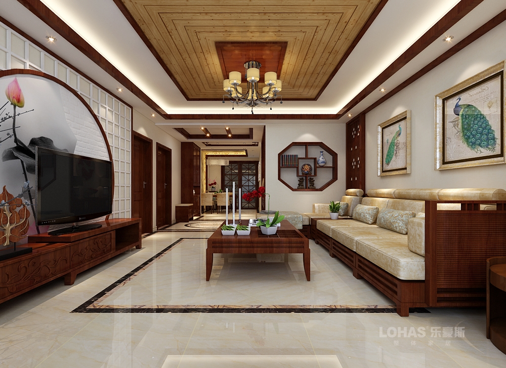 电视墙采用中式的漏窗进行装点,地面是白色背景,中间的荷花非常的优美自然。