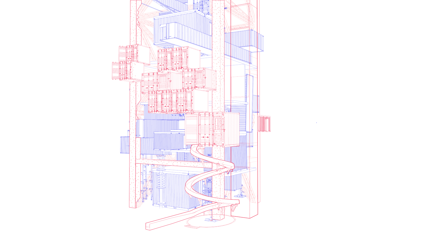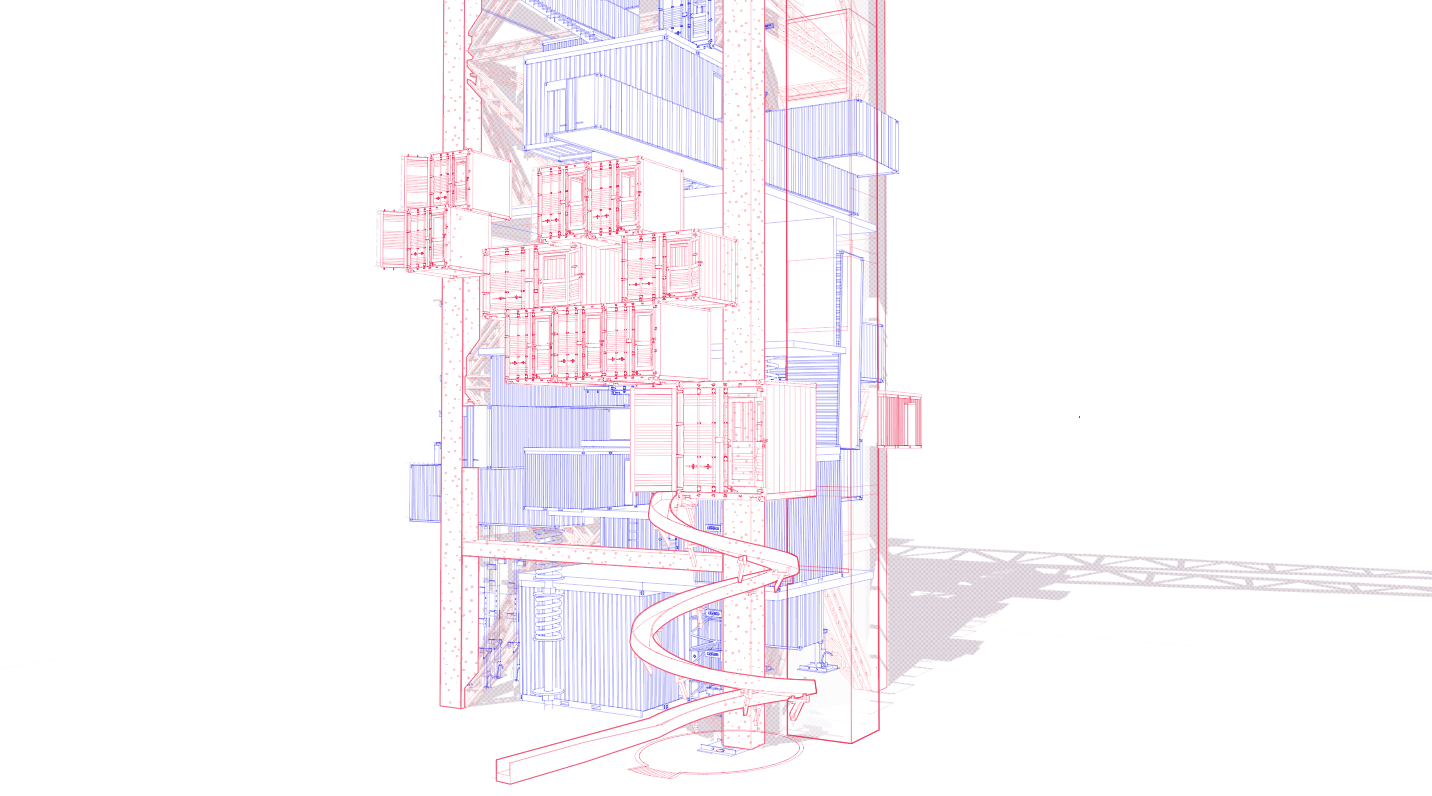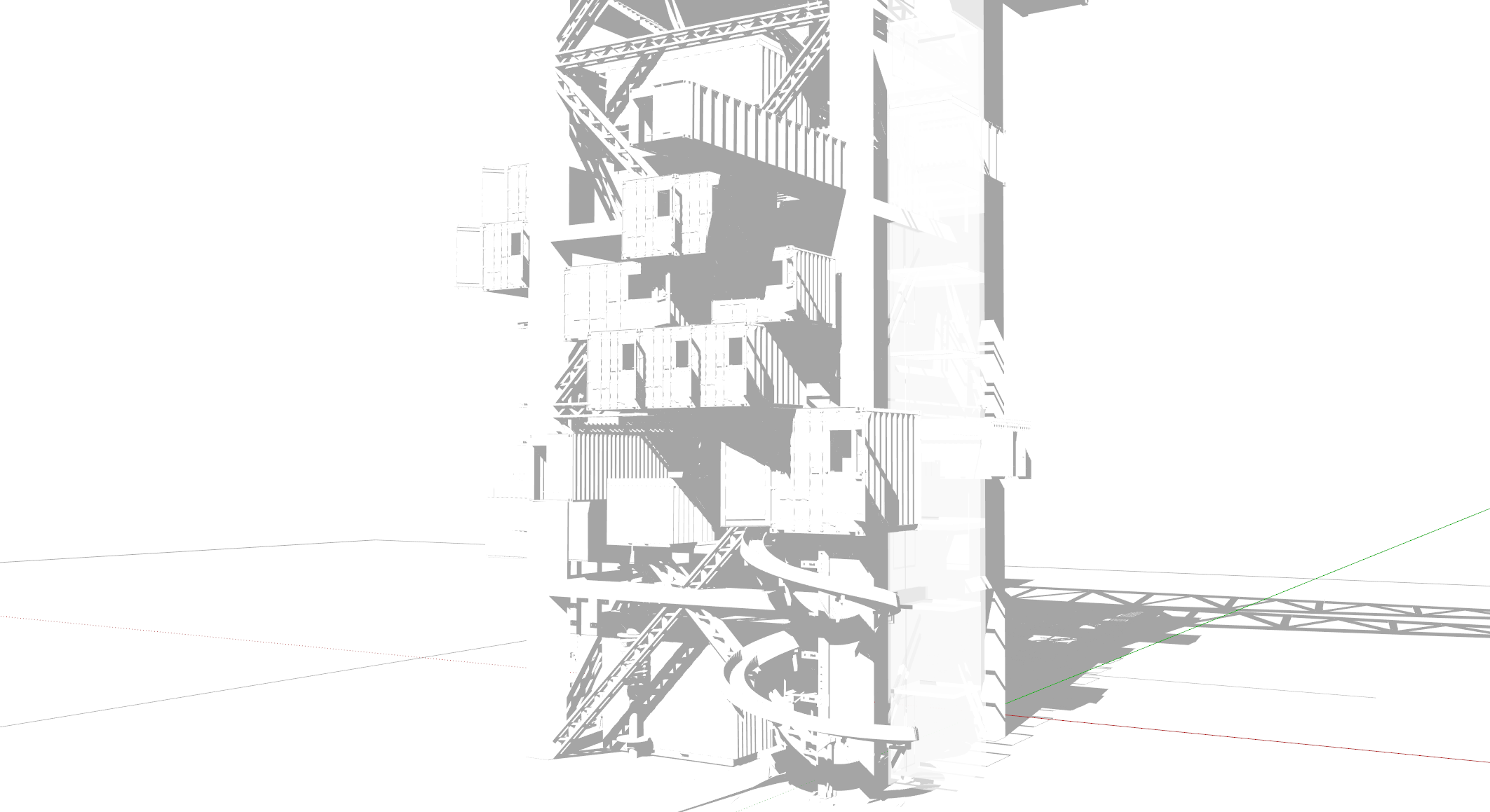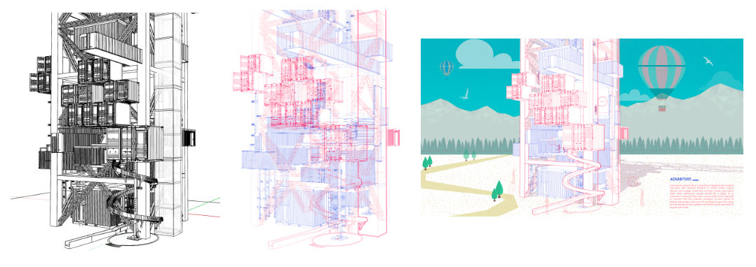 4.由于线型都叠加在一起,比较乱,层次感不强,所以我根据模型中实际的前后遮挡关系,在图里使用钢笔工具画出相应面积的白色进行遮挡,营造出前后关系。