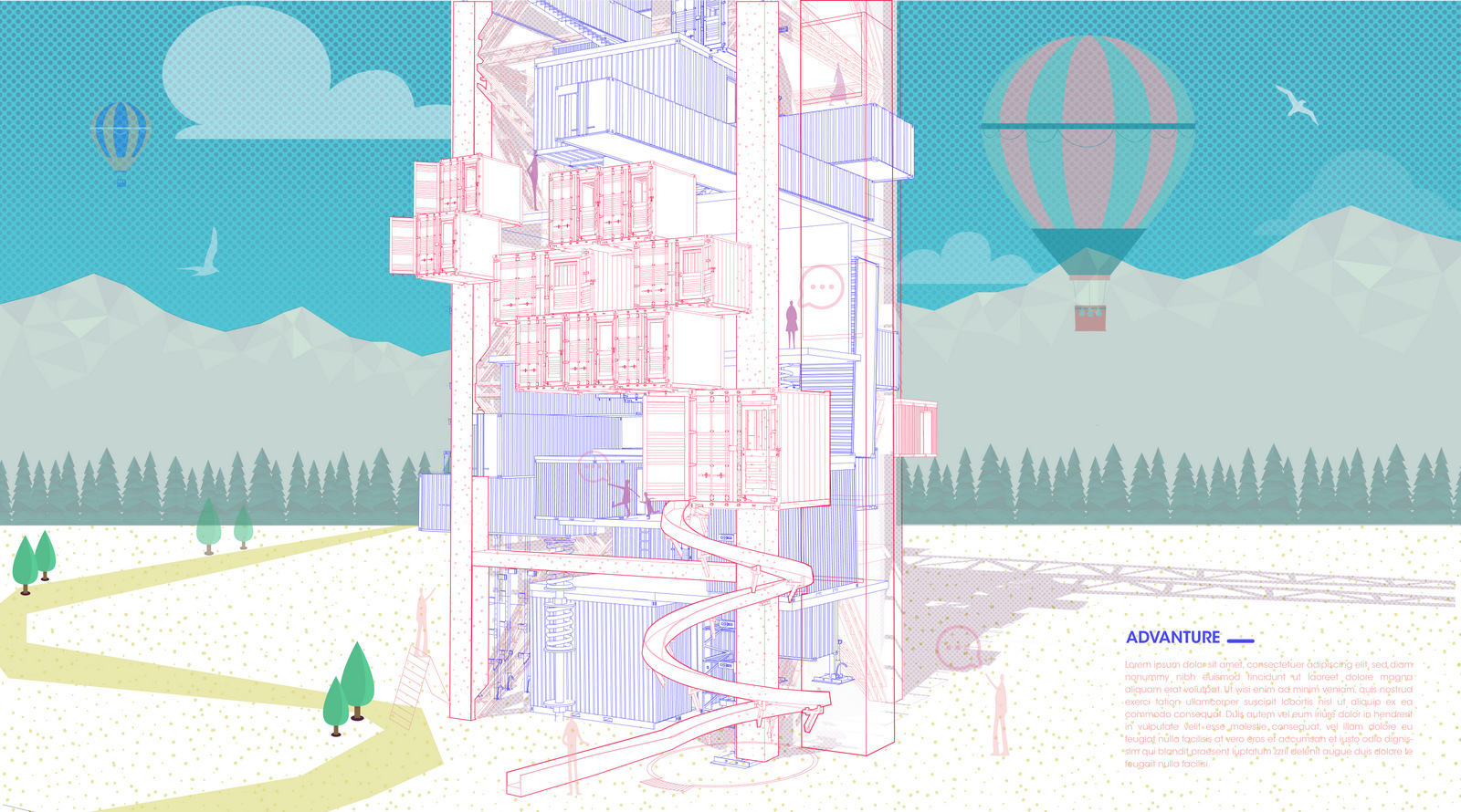 8.制作背景。我下载了一些矢量素材,比如热气球,云,鸟,山和林,道路。背景的加入使得整个画面有了环境,变得更加生动又气氛。图12