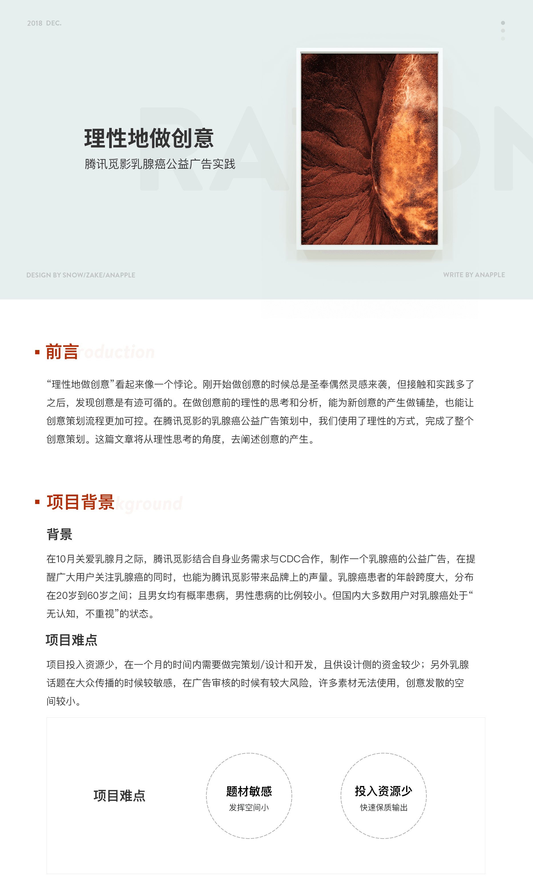 这是我从京东来到腾讯CDC接的第一个项目。第⼀次接触公益类的创意项⽬,也是第⼀次主导创意策划的部分。希望的确有所成长吧。