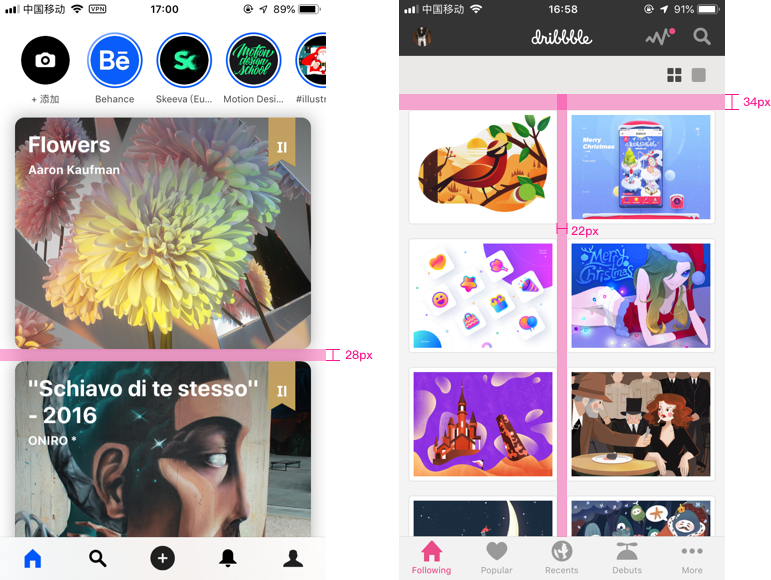 一款app中除去刚提到那些有明确数值区间的控件以外,剩下的内容布局和间距就比较灵活多变了,没有具体的规定。