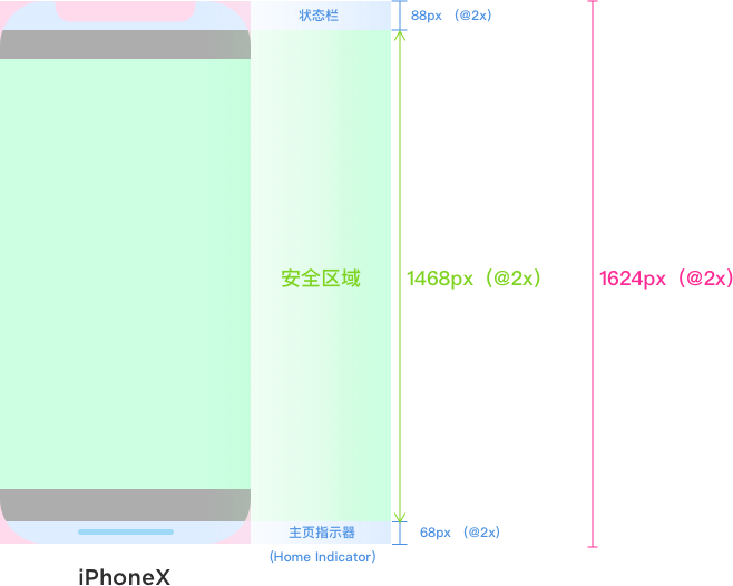 由于iPhone X 的像素分辨率发生了变化,为1125*2436px(@3x),在实际工作中为了方便向上和向下的适配,我们仍然可以选择熟悉的 iPhone 7(750*1334px)的尺寸作为模版进行设计,只是高度增加了290px;设计尺寸为:750*1624px(@2x)。设计完成之后将设计稿的图像大小拓展1.5倍即可得到1125*2436px(@3x)尺寸的设计稿。这里要注意状态栏由之前的40px增加到88px,标签底部预留68px用于放置主页指示器。