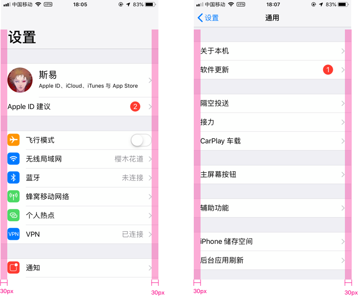 30px(最舒服的边距,iOS系统采用的是30px。)