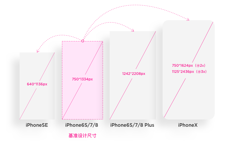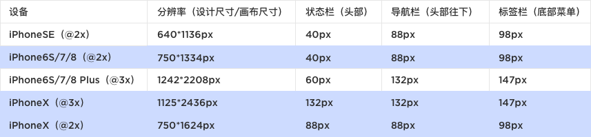 蓝色部分是较为常用的设计尺寸其中 iPhone6S/7/8 Plus 和 iPhoneX 设计尺寸采用的是3倍率,其他则是2倍率分辨率。(@3x、@2x)