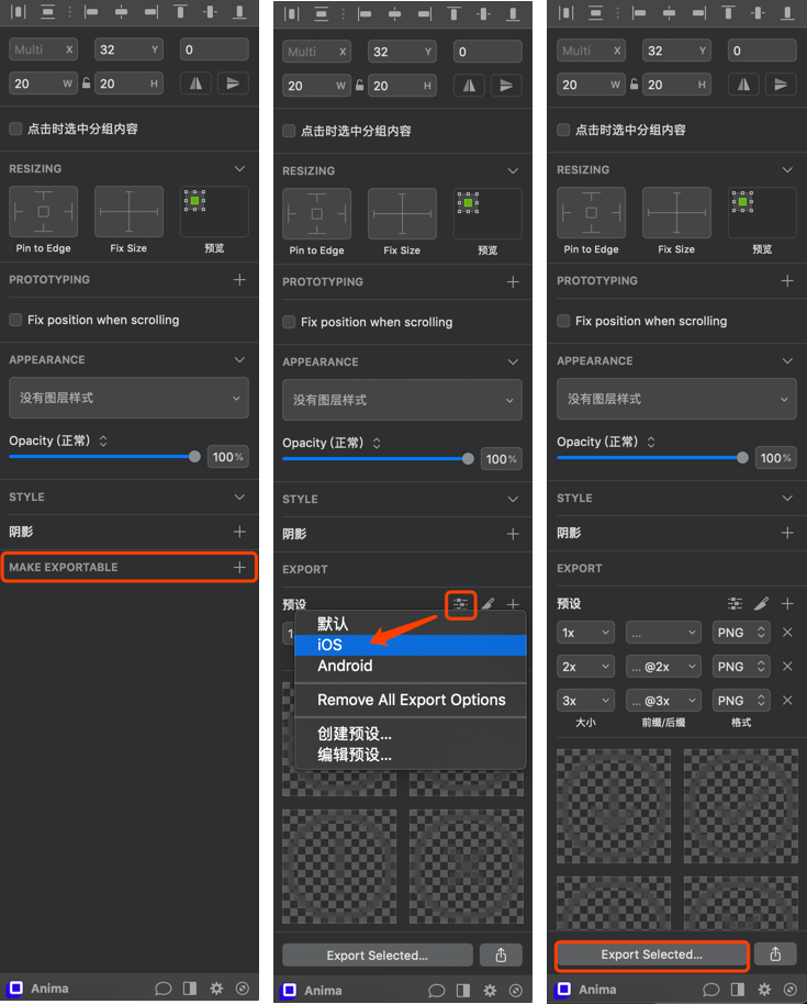 给每一个图标建立好参考线之后,用 sketch 自带的切片功能,点击 MAKE EXPORTABLE 输出想要的尺寸的PNG图片即可。(PNG 格式拥有更多的颜色和细节并且支持透明)