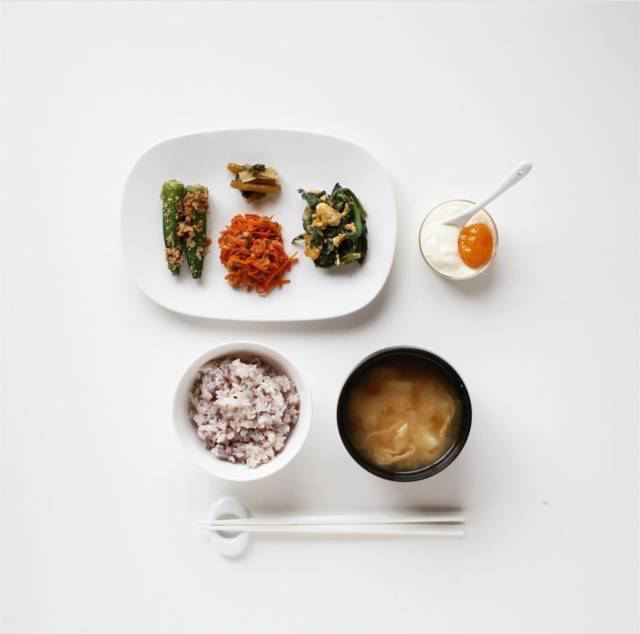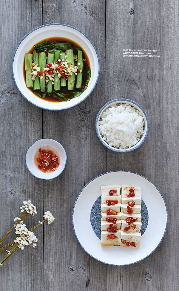 第二,色泽鲜艳,对比强烈。“红配绿,赛狗屁”这种话忘记它,一盘青菜加几颗鲜香的小米辣能极大地提高食欲。多用对比色,如红——绿,黄——蓝,紫——青等。