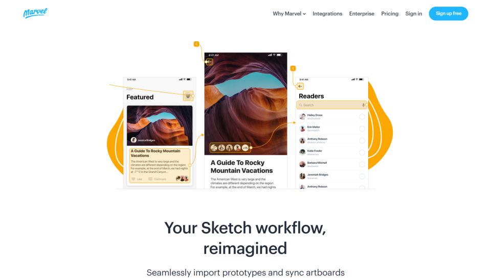 Marvel是一款免费的原型设计Web 应用,可以进行网页设计和移动端的UI设计。它根据你设计好的 PSD 或 Sketch 文档,也就是说你的视觉稿无需转换格式就可以使用,当然线稿图(.jpg or .png)也可以,导入后进行后续的交互设计。