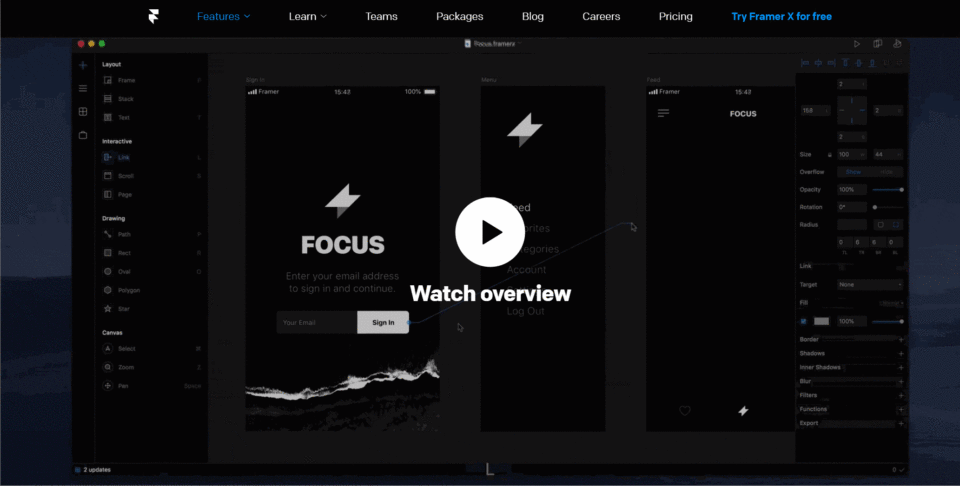 与其他几款原型设计工具不同,Framer 可能是最特别的一款原型工具,因为它要求设计师具备代码能力。而它制作出来的原型也最接近真实效果。它支持调用系统键盘,输入真实的文本,然后作为数据被使用;它支持对音频、视频进行真实的控制与监听;Framer 的强大来自于它对 HTML、CSS 以及 Javascript 的无缝支持,单是音频和视频,就有数十种属性和事件可以拿来用。