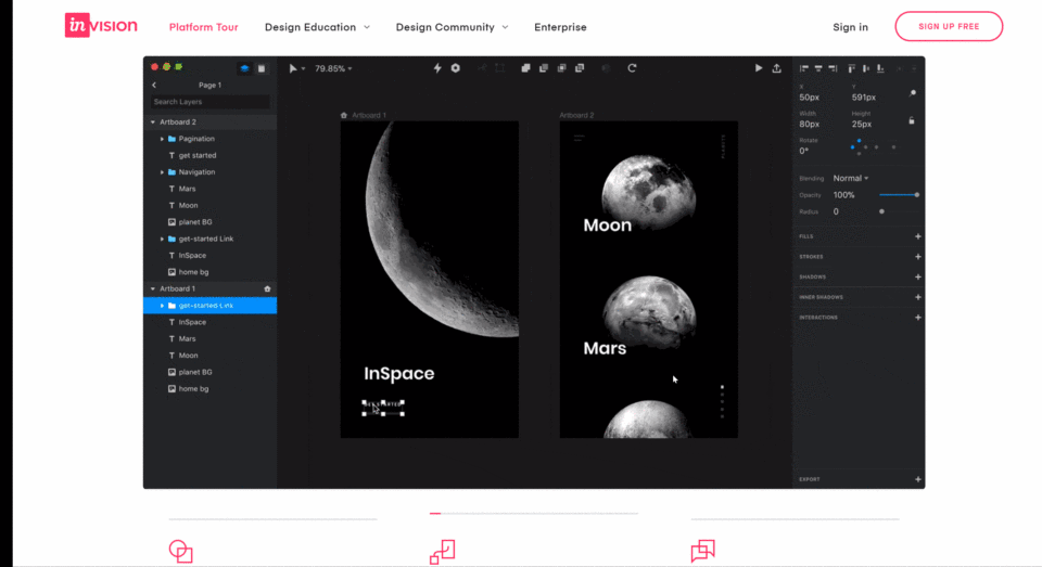 从官网的介绍可以了解到,InVision的原型设计方式也是通过添加链接的方式。界面元素中添加链接到画板,设置过渡动画并添加微交互,将静态画面转换为交互原型。