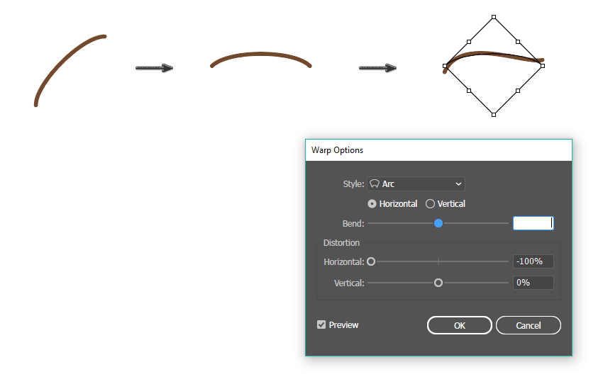 之后,在保持选定圆弧的同时,转到效果>变形>弧形,在新对话窗口中,输入在下方看到的选项,然后按下确定,接下来展开图形“对象”>“扩展外观”