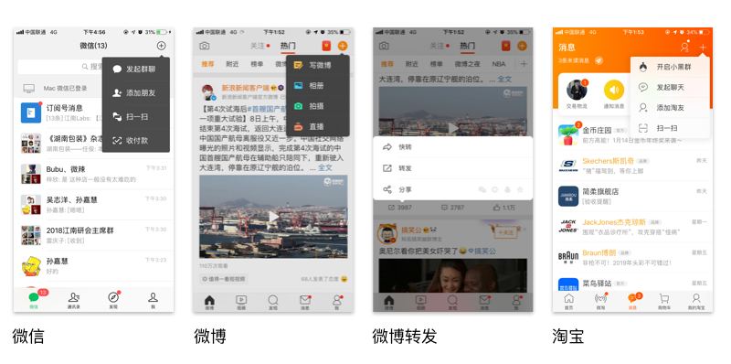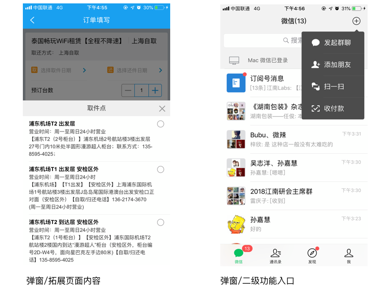 弹窗相对页面来说更加轻量,可以承载页面部分信息或功能,尤其是页面内涉及多层级的任务操作,通过弹窗可以让用户不离开当前页面的情况下完成任务操作。如下图携程订单页面,页面承载了大量的信息和操作,如果让用户点击后进入新页面则增加了费力度,因此通过弹窗来承载部分功能操作,再如微信中通过弹窗来集合功能。