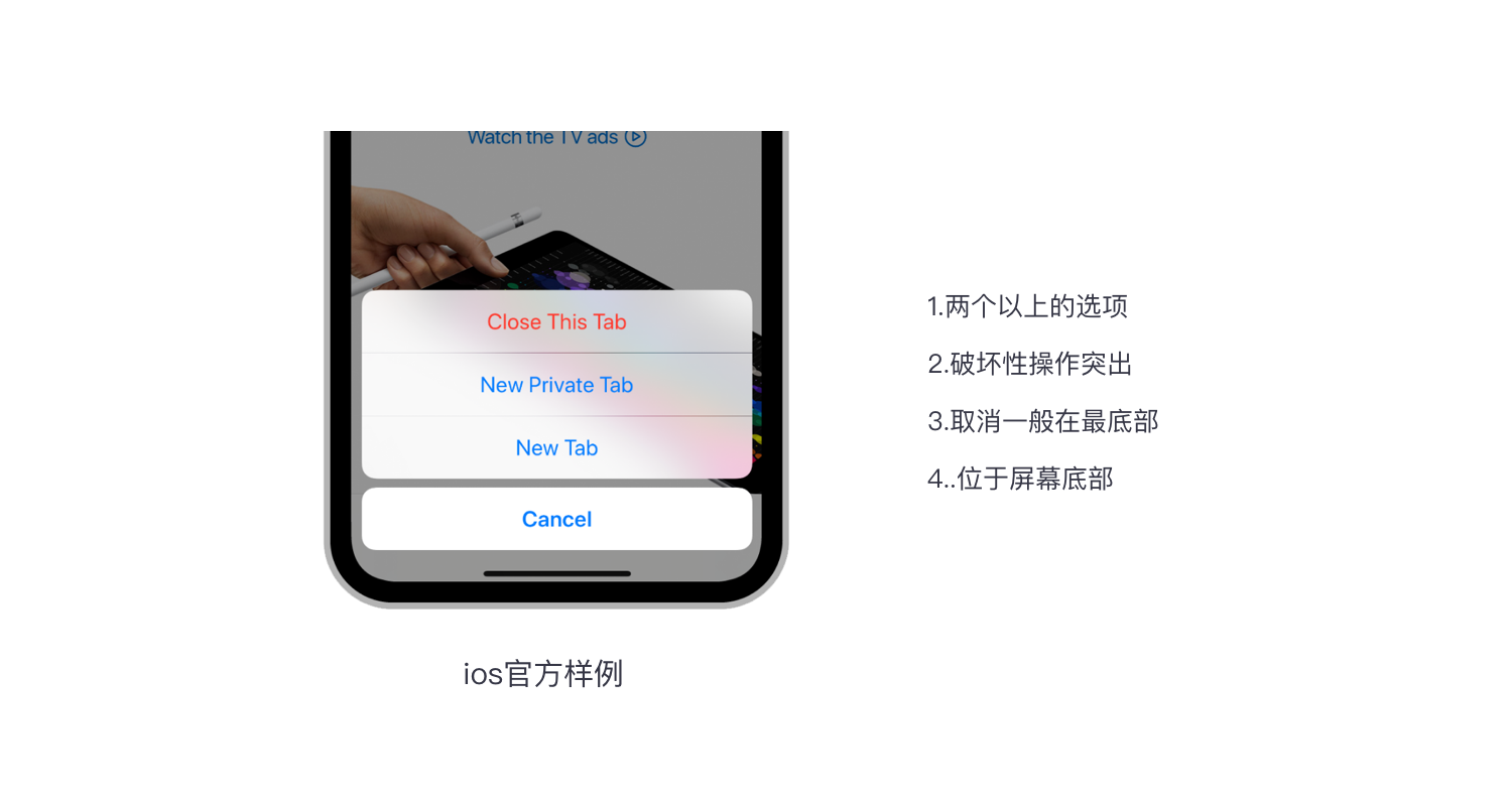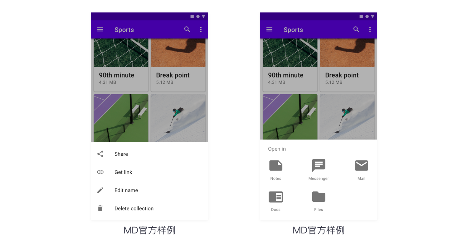 定义:操作栏与浮层功能类似,一般出现在页面底部,被设计用来向用户展示多个功能按钮供用户选择操作。点击取消或空白处关闭操作栏。iOS和MD样式上存在区别,如下图:
