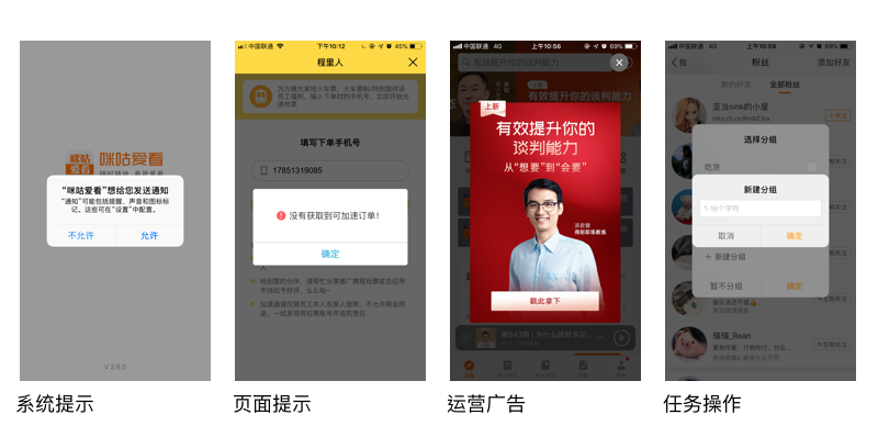场景:对话框主要可以分为提示类和操作类,具体包括系统提示、页面提示、运营广告、任务操作