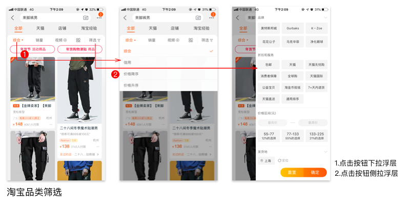属于浮出层的衍生应用,和上个场景一样,节约屏幕空间,显露出一部分,并将剩余信息折叠起来,不影响用户理解功能,又解决了屏幕空间,若用户有需求,即可展开探索更多的信息,同样也会用箭头等指向出处。特别是购物类应用中筛选操作,都通过下拉或侧拉浮层来进行筛选。