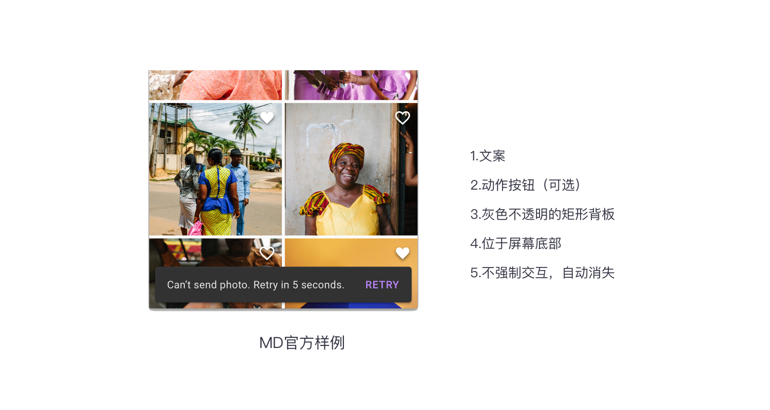 定义:属于安卓控件,一种轻量级的反馈机制,常以小弹框的形式出现在页面底部,可包含操作按钮。一般情况,用户点击snackbar内功能按钮,执行操作,弹窗消失,或一定时间内自动消失。