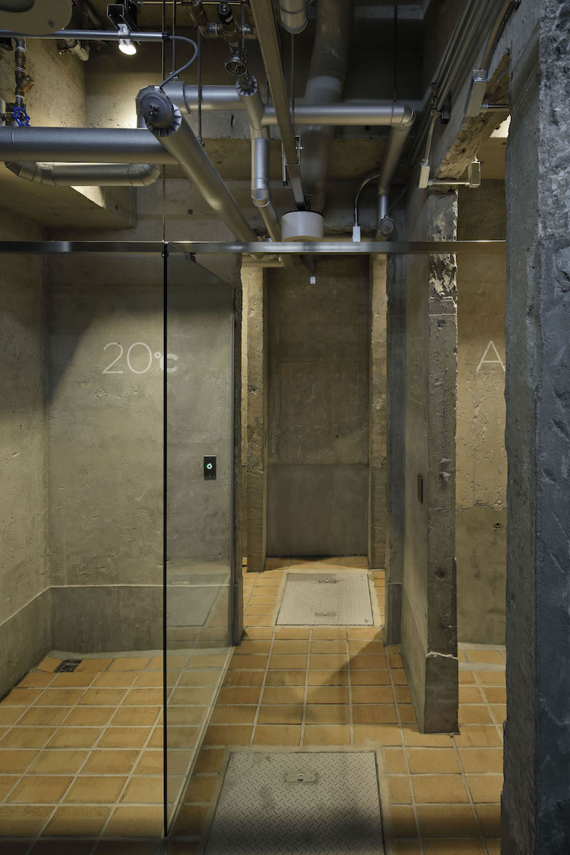 旅馆为工业风和极简风的混合体,Hiromura design设计了简约的导视系统。Logo使用铁锈红色,标牌使用灯光效果,使人感觉温暖。基于胶囊旅馆的自助性较强的特点,设计了丰富的icon,所有功能区域都附有明确的指示说明,字体设计较为纤细,信息层级划分合理。Hiromura design放大各个步骤的英文第一个字母使流程更直观地呈现,信息传达度高。人们可以根据楼层高度享受不同的热强度,因此墙壁上设有温度标识。导视系统把胶囊单元和裸露的内部连结在一起,极简的工业风格刷新了人们对昭和时代风格胶囊酒店的过时印象。