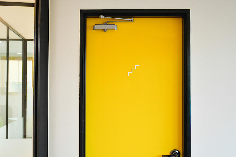 Everyday practice根据居民中心的装修风格,设计了简洁的导视系统,字体设计较为现代化,使用无衬线字体,信息易于辨识。使用橙黄色作为主色调,使办公氛围活泼,突出指示信息。在大门入口旁配备了立式信息导视牌,用作公告栏和地图指示。