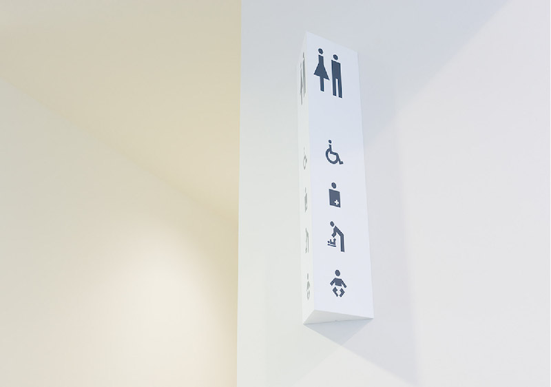 基于弧形的天花板和良好的光照,Uji design设计了一套简约质朴的导视系统。采用黑白的配色,打造清新干净的阅读环境,使用无衬线字体,信息易读。针对图书馆场所特殊性,Icon设计更加全面。书架上的字体较大,户外立式导视板和室内标牌采用三角柱体,方便人们从不同角度获取信息。