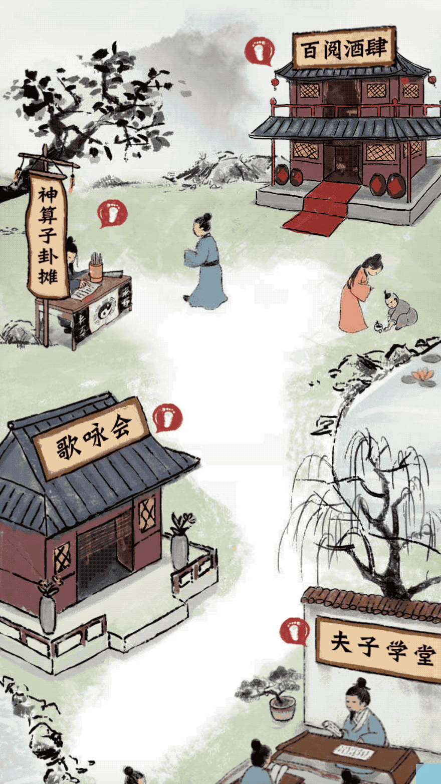 不只是我,相信在很多人的印象中,水墨感的设计大约都是上图中水墨笔触做为装饰或背景,用来塑造氛围。而在此项目中需要用水墨风格表现热闹的场景,其中的建筑和小场景要跳出整幅画面,提醒用户可点。以上水墨的用法恐怕无法实现。