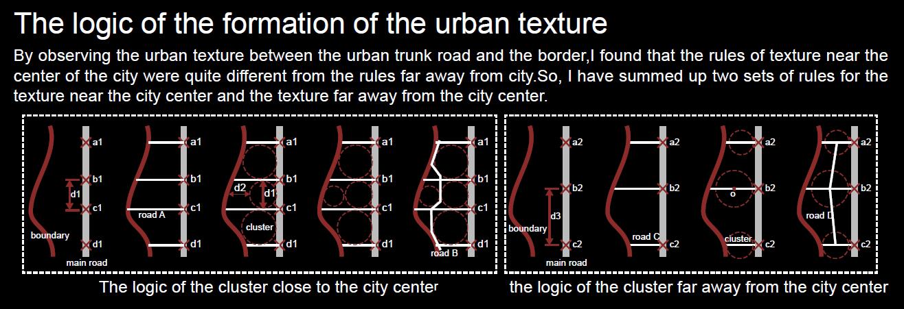 过观察城市主干道与边界之间的城市肌理,我发现城市中心附近的纹理规则与远离城市的规则有很大不同。因此,我总结出了两套规则 靠近市中心的质地和远离市中心的质地。