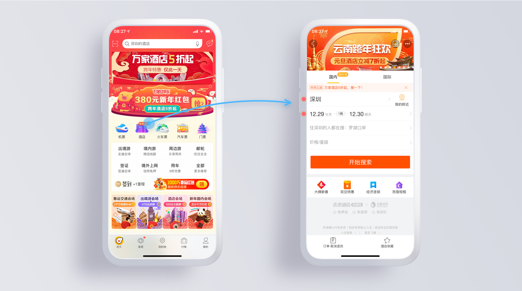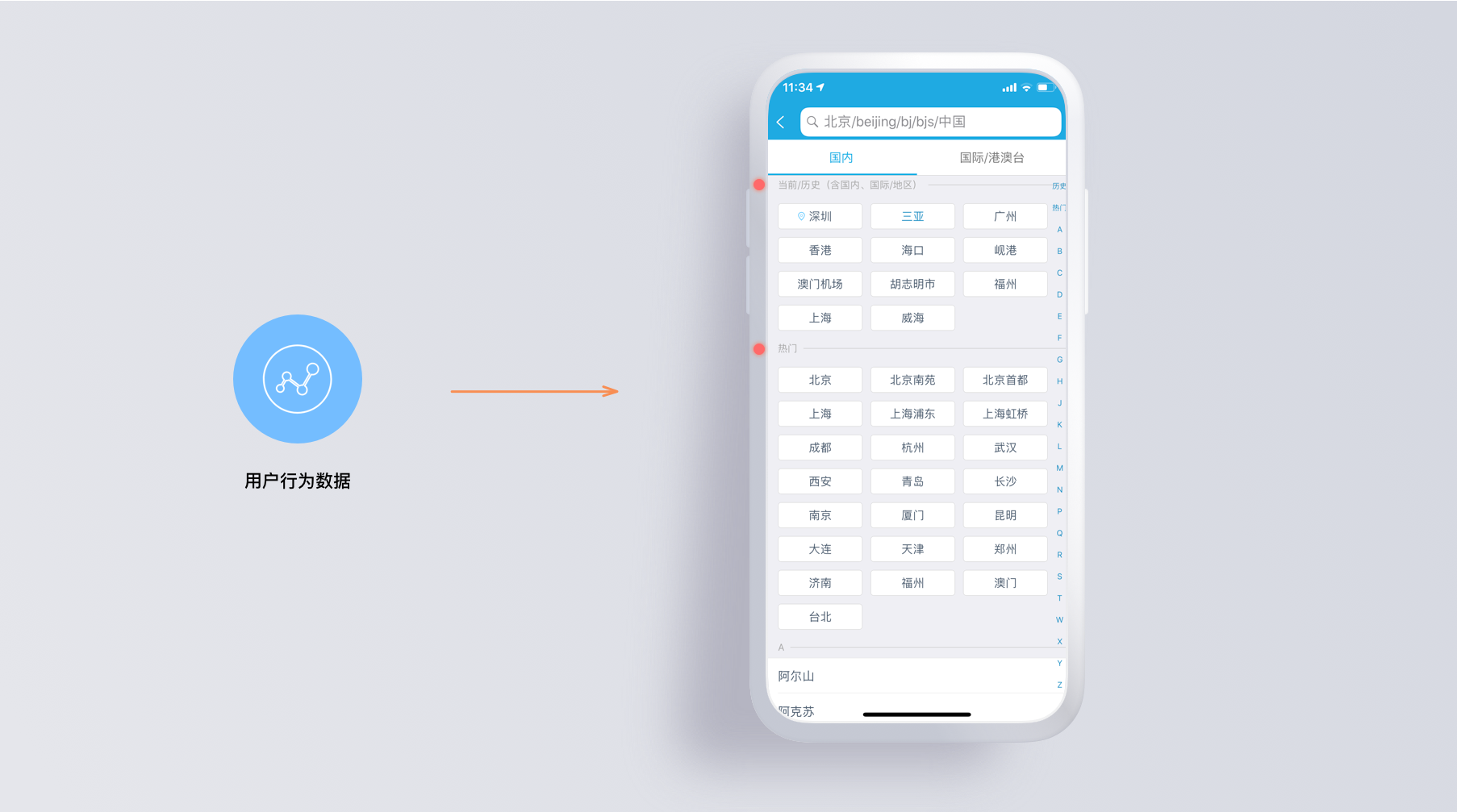 在旅游类产品的地址选择中可以看到,系统会将最常使用与最近使用做选项突出,符合隐形用户行为,更快的选择到自己想去的沉睡。
