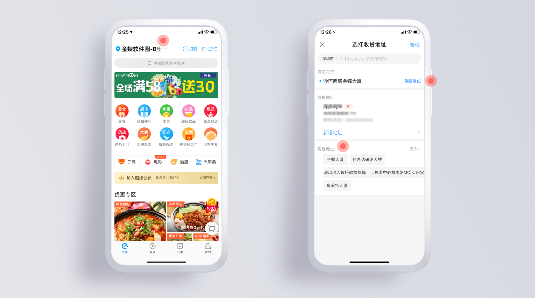 在饿了么APP中,机器可以自动抓取到用户所在地的地理位置,从而进行合理推荐,但是也提供了快速切换的操作,并且在快速切换的页面下,丰富地承载了重新定位、收货地址、附近地址三条路径,机制灵活,可以满足基本上所有的用户场景。