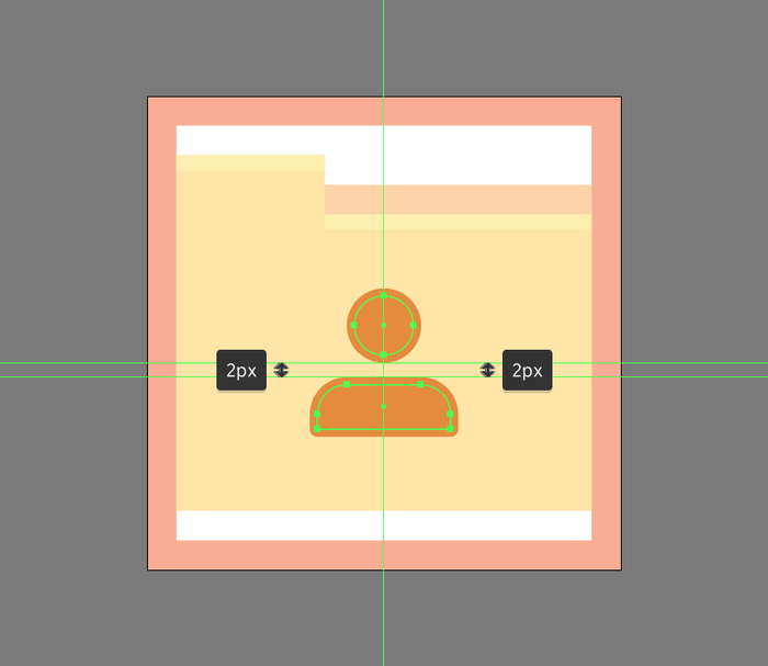 创建2 px宽轮廓(#E58C3C)的8 x 8 px圆(#E58C3C)作为头部,分组(Control-G)然后将两个中心对齐到较大的主体,将它们定位在距离身体2px的上端。完成后,请确保选择并分组(Control-G)所有图标的组成形状,然后再转到下一个图标。